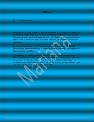 La docente recordó las notas del periodo y la importancia de las bitácoras. Luego, los estudiantes vieron videos sobre Excel y realizaron ejercicios cambiando los datos y aumentando la cantidad para evitar copiar. Al final, la maestra recogió los computadores y recordó subir las actividades a la web para su calificación.