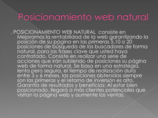El documento presenta varias opciones para el posicionamiento web, incluyendo posicionamiento natural que toma 3-6 meses, posicionamiento privado mediante pago por clic en anuncios, y varios servicios de diseño web, posicionamiento y gestión de campañas de pago por clic.