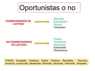 Este documento resume las características clínicas y microbiológicas de varias enterobacterias oportunistas. Brevemente, describe los géneros principales (Klebsiella, Enterobacter, Serratia, Proteus, Morganella, Providencia y Citrobacter), sus reservorios, patologías asociadas como infecciones nosocomiales e ITU, y métodos básicos de identificación en laboratorio.