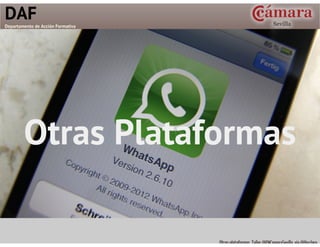 Otras Plataformas es la clase de 5h para el VIII Curso de CCMM de la cámara de comercio. La clase está preparada en PREZI para hablar y demostrar sobre la marcha sobre esas nuevas plataformas. Puedes verla interactiva en prezi -> http://prezi.com/j6k6jeyoameq/?utm_campaign=share&utm_medium=copy Contenidos: Fundamentos de una nueva plataforma. Cómo afecta a los usuarios. Las 5 Claves del éxito de una nueva plataforma Ejemplos de empresas, profesionales y buenos hábitos en todas las plataformas Plataformas en tres grupos: Productivdad, Comunicacion o difusión, Imaginario. Prezi Netvibes Scoop.it SocialBro Google Drive & Hangout Dropbox Box.net Zyncri Trello Podio Evernote Flickr Vimeo Tumblr Posterous Pinterest Fancy Moodyo Específicas de CrowdFunding Shareor EdCanvas Vine Viddy Instagram