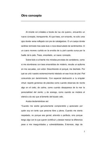 Este documento explora un nuevo concepto de amor que va más allá de la atracción física o la pasión. Describe un amor basado en el respeto mutuo, la comprensión y el deseo de evolucionar juntos. También sugiere que este amor puede extenderse a los hijos de la pareja y formar un vínculo más profundo entre la familia. El autor propone que este nuevo tipo de amor puede brindar consuelo a parejas separadas o divorciadas al crear un "océano azul" que los una espiritualmente.