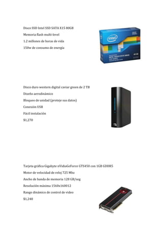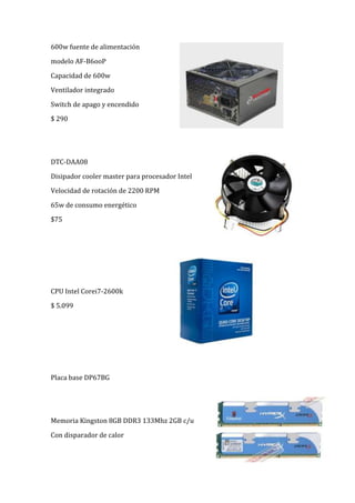El documento lista los componentes y precios de una computadora personal. Incluye una fuente de alimentación de 600w, un disipador para procesador Intel, un procesador Intel Core i7, una placa base, memoria RAM de 8GB, un disco SSD de 80GB, un disco duro de 2TB, una tarjeta de video Gigabyte con 1GB de memoria, un reproductor Blu-Ray LG, un teclado y mouse inalámbricos Logitech. Los precios de los componentes varían entre $75 para el disipador y $5,099 para el