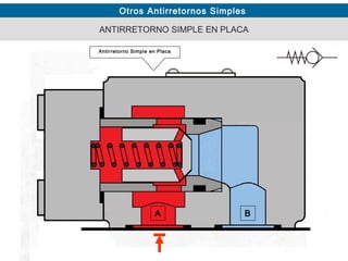 El documento describe diferentes tipos de antirretornos simples, incluyendo antirretornos en placa, en codos y con chicle. También menciona una pequeña fuga detectada en un antirretorno con chicle.