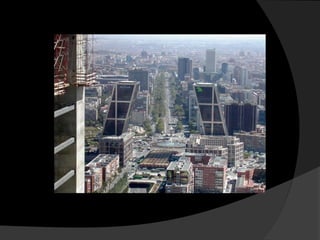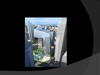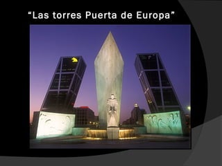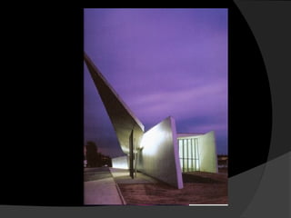 El documento presenta información biográfica y obras principales de cuatro arquitectos reconocidos: Philip Johnson, Rem Koolhaas, Daniel Libeskind y Bernard Tschumi. Johnson fue un arquitecto estadounidense conocido por obras como las Torres Puerta de Europa. Koolhaas es un arquitecto holandés galardonado con el Premio Pritzker que destaca por sus edificios de masa consistente. Libeskind es un arquitecto polaco-estadounidense reconocido por el Museo Judío de Berlín. Finalmente, Tsch