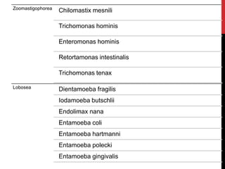Este documento describe varios protozoos intestinales como Chilomastix mesnili, Trichomonas hominis, Enteromonas hominis, Retortamonas intestinalis, Trichomonas tenax, Dientamoeba fragilis, Iodamoeba butschlii, Endolimax nana, Entamoeba coli, Entamoeba hartmanni, Entamoeba polecki, Entamoeba gingivalis, Naegleria, Acanthamoeba, Hartmanella, e Isospora hominis, I. belli, I. natalensis, I. can