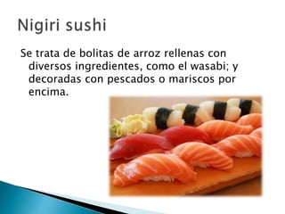 Este documento describe cuatro tipos de sushi: 1) Ottavio Cautilli, bolitas de arroz rellenas con wasabi y decoradas con pescado o mariscos, 2) Arroz enrollado en algas Nori con pescado crudo o cocido y mariscos, 3) Un bloque de arroz prensado en un molde con capas de ingredientes, 4) Arroz y algas moldeadas a mano en forma de cono y combinadas con pescado, mariscos y vegetales.