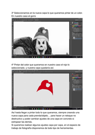 El documento proporciona instrucciones paso a paso para colorear una fotografía en blanco y negro utilizando capas. Primero, se selecciona una foto en blanco y negro y su versión a color como referencia. Luego, se crea una nueva capa para cada elemento que se desea colorear, como un gorro rojo, pintándolo del color deseado en esa capa. Este proceso se repite para cada elemento, permitiendo ajustes individuales por capa sin afectar a las demás. Al final, la foto en blanco y negro