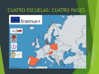 Este documento describe un proyecto Erasmus+ entre cuatro escuelas de cuatro países diferentes: Austria, Polonia, Dinamarca y España. El proyecto utilizará métodos de enseñanza alternativos como el teatro y el vídeo. Incluirá intercambios de estudiantes y profesores entre las escuelas, con el objetivo de mejorar el conocimiento de otras culturas y lenguas. La escuela española acogerá a 18 estudiantes extranjeros en marzo, y enviará a 6 estudiantes a cada una de las otras escuelas