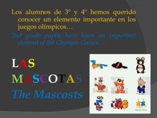 El documento describe las mascotas olímpicas de varios Juegos Olímpicos pasados, incluyendo animales como un perro, un oso, un águila calva y un panda. También menciona que los estudiantes crearon sus propias mascotas potenciales para Juegos Olímpicos hipotéticos en su ciudad, incluyendo birllas, una gota de agua, y un perro de caza.