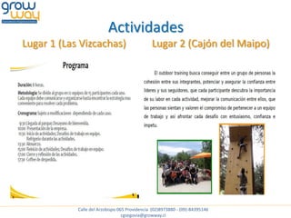 El documento describe dos lugares para realizar actividades al aire libre, Las Vizcachas y el Cajón del Maipo, y un menú que incluye desayuno, almuerzo y café con opciones como panes, huevos, lomo a la parrilla y tapaditos de jamón-queso. También incluye los detalles de contacto de la empresa organizadora.