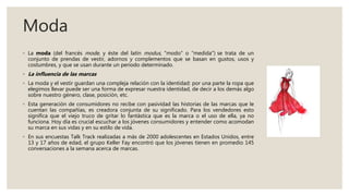 Este documento discute varios temas relacionados con la moda y los outfits. Explica que la moda se basa en gustos, usos y costumbres de un período determinado, y que la ropa que elegimos puede expresar nuestra identidad. También analiza la influencia de las marcas en los consumidores, especialmente los adolescentes, y ofrece consejos sobre cómo formar outfits casuales, de verano, invierno y otoño.