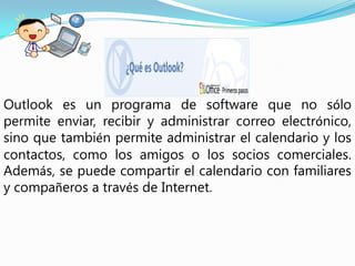 Outlook es un programa de software que permite enviar, recibir y administrar correo electrónico, calendarios y contactos. Forma parte de Microsoft Office, una suite de productividad que incluye programas para crear documentos, hojas de cálculo y presentaciones. Outlook también puede administrar noticias, artículos de blog y sesiones de chat.