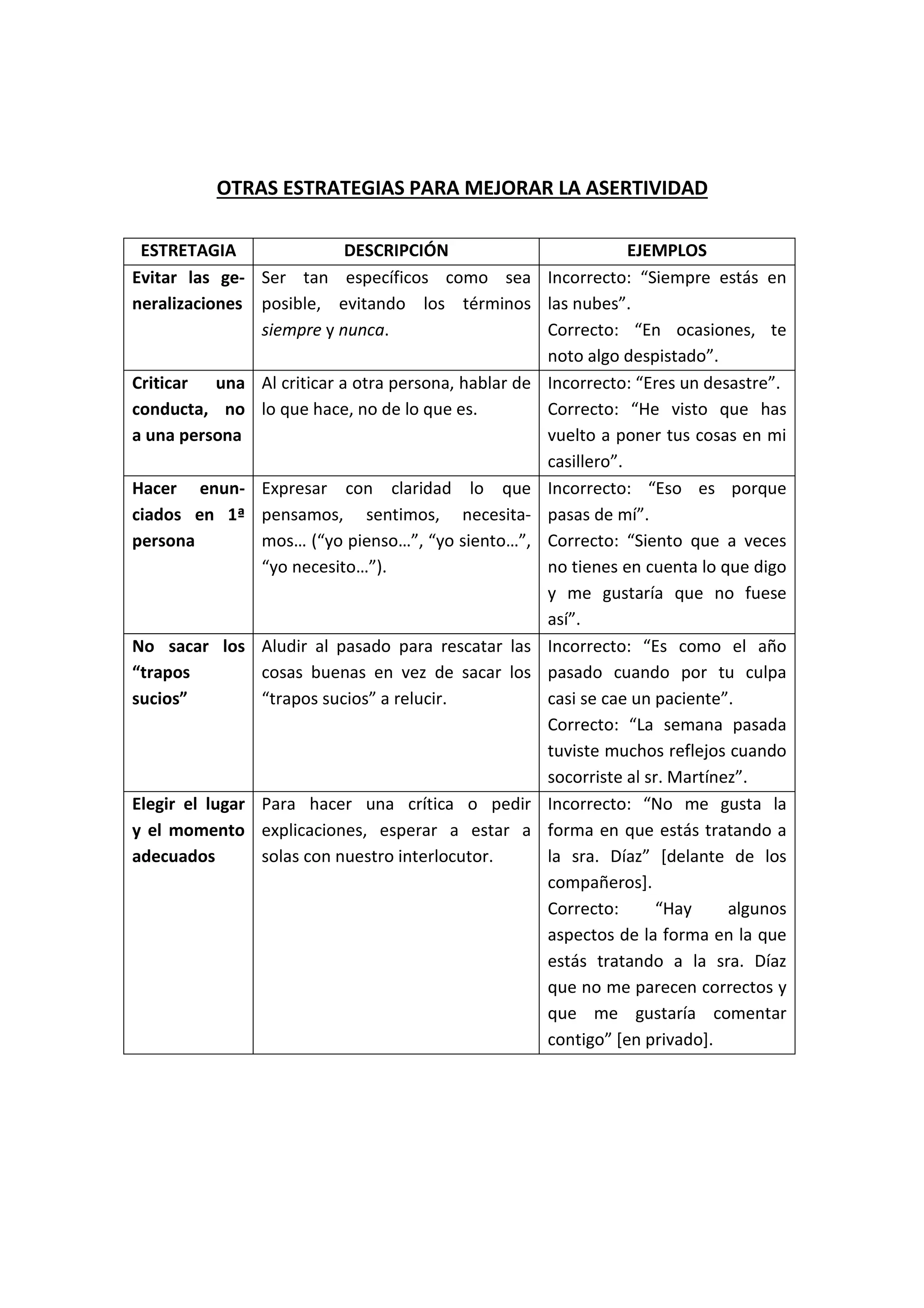 Este documento describe estrategias para mejorar la asertividad. Explica que se debe evitar hacer generalizaciones y criticar conductas específicas en lugar de a la persona. Además, se recomienda expresar cómo nos sentimos y qué necesitamos usando la primera persona, no sacar problemas del pasado, y elegir un momento privado para dar críticas o pedir explicaciones. Por otro lado, define un rumor como información no confirmada sobre un tema que se transmite oralmente, y explica tres leyes básicas sobre su transmisión: la probabilidad de transmisión