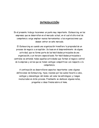 Este documento trata sobre el outsourcing y sus aspectos clave. Explica que el outsourcing implica transferir un proceso de negocio a un proveedor externo para aprovechar su especialización. Luego describe brevemente la historia, definición, tipos y razones para usar outsourcing, así como ventajas como reducción de costos y desventajas como pérdida de control. Finalmente, concluye que el outsourcing es una tendencia creciente que permite a las empresas enfocarse en lo principal y acceder a mejores servicios.
