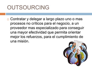 El documento habla sobre outsourcing y sus ventajas. Algunas ventajas de outsourcing son reducir o controlar gastos de operación, tener acceso a capital efectivo, y manejar funciones difíciles o fuera de control de manera más fácil. El documento también incluye una tabla para analizar empresas considerando factores como cobertura de servicios, experiencia, flexibilidad, seguridad, y costo de servicio.