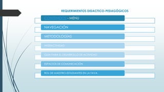 Este documento proporciona requerimientos para orientar procesos formativos a distancia basados en planes de estudio utilizando TIC. Describe contenidos, navegación, metodologías e interactividad requerida. También incluye guías para el desarrollo de actividades, espacios de comunicación y los roles de maestros y estudiantes en entornos de formación a distancia.