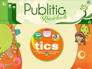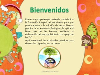 Este documento presenta un proyecto educativo que busca contribuir al desarrollo integral de los estudiantes para que puedan ayudar a resolver los problemas ambientales de su comunidad. El proyecto promueve el buen uso de la basura a través de la creación de materiales publicitarios con tecnologías de la información para crear conciencia sobre la importancia del reciclaje.