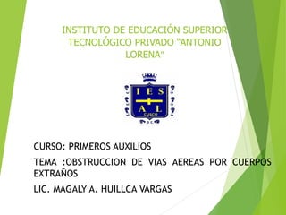 El documento trata sobre un curso de primeros auxilios en el Instituto de Educación Superior Tecnológico Privado "Antonio Lorena". El tema del curso es la obstrucción de las vías aéreas por cuerpos extraños y fue impartido por la Lic. Magaly A. Huillca Vargas.