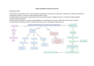 Este documento presenta un mapa conceptual sobre la gerencia de proyectos y el ciclo de vida de un proyecto. Explica que el desarrollo de un proyecto requiere definir objetivos y asignar responsabilidades a los participantes para identificar, definir y coordinar los procesos y actividades necesarias para alcanzar las metas propuestas. También destaca la importancia de tener una persona capacitada que dirija el proyecto y delegue tareas para lograr los resultados planificados.