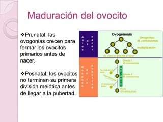 La ovogénesis es el proceso por el cual las ovogonias se transforman en ovocitos maduros a través de dos etapas: la prenatal, donde las ovogonias crecen para formar los ovocitos primarios antes del nacimiento, y la posnatal, donde los ovocitos completan la primera división meiótica al llegar a la pubertad.