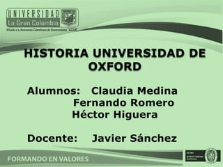 La Universidad de Oxford fue fundada en el siglo XII en Inglaterra y es la institución de educación superior de habla inglesa más antigua del mundo. Está organizada como una federación de colegios y departamentos académicos, y ha educado a 26 primeros ministros británicos, premios Nobel, y otros líderes internacionales a lo largo de su historia de más de 800 años.