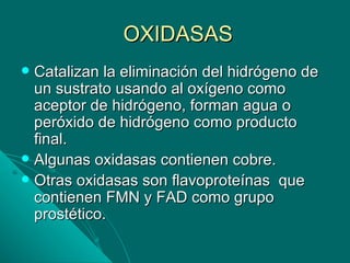 El documento clasifica las enzimas involucradas en las oxidaciones biológicas en cuatro grupos: oxidasas, deshidrogenasas, hidroperoxidasas y oxigenasas. Describe las características y funciones principales de cada grupo y algunas enzimas específicas.