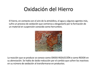 El hierro se oxida y forma herrumbre cuando entra en contacto con el aire y el agua debido a una reacción de óxido-reducción. Las reacciones redox ocurren comúnmente en la naturaleza y en nuestros cuerpos, y también son importantes para almacenar energía en dispositivos como baterías al separar un cátodo de un ánodo.