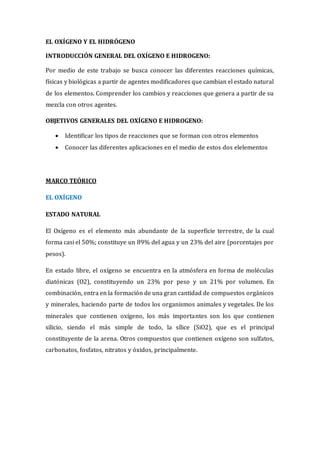 Este documento describe las propiedades y reacciones del oxígeno y el hidrógeno. Explica que el oxígeno constituye el 21% del aire y forma parte de compuestos orgánicos e inorgánicos. El hidrógeno se encuentra en pequeñas cantidades en la atmósfera pero es abundante en el agua. Ambos elementos reaccionan con otros para formar óxidos y agua.