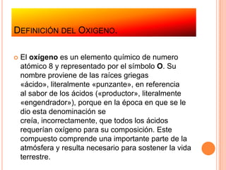 El oxígeno es un elemento químico esencial para la vida en la Tierra. Comprende aproximadamente el 21% de la atmósfera y el 50% de la corteza terrestre. Fue descubierto de forma independiente por Joseph Priestley en 1774 y Carl Wilhelm Scheele en 1772, aunque Priestley fue el primero en publicar sus hallazgos. El oxígeno se encuentra naturalmente en estado gaseoso como moléculas diatómicas O2 y es incoloro, inodoro e insípido. Es un comburente importante que se combin