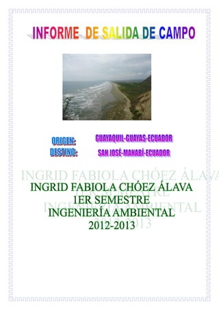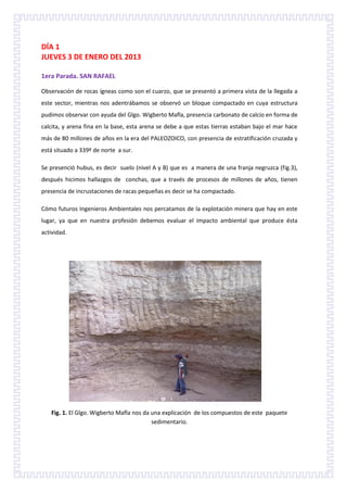 El documento describe las observaciones de un viaje de campo de 4 días a diferentes lugares de la provincia de Manabí, Ecuador. En cada parada, el grupo estudió las formaciones rocosas y sedimentarias presentes, incluyendo minerales como cuarzo, calcita y yeso. También observaron procesos como estratificación, fallas geológicas e impactos ambientales de la minería. El viaje les permitió analizar la geología y ecología de la región costera de Manabí.