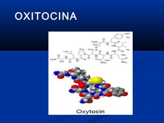 La oxitocina se sintetiza junto con la vasopresina en las neuronas de los núcleos supraóptico y paraventricular del hipotálamo. Se transporta a la neurohipófisis donde se almacena y se libera en respuesta a estímulos nerviosos. La oxitocina aumenta la concentración intracelular de calcio y regula las propiedades contráctiles del útero, produciendo la liberación de prostaglandinas que inducen el parto.