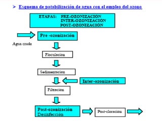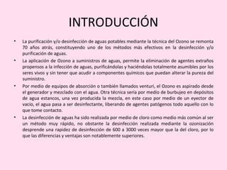 Este documento describe el proceso de ozonización del agua. Resume la introducción del ozono como método efectivo de desinfección y purificación de aguas. Explica que la ozonización permite eliminar agentes infecciosos sin usar químicos que alteren la pureza del agua. Luego, detalla los procesos de generación, aplicación e inactivación del exceso de ozono, así como las características físicas y químicas del ozono y su mecanismo de acción sobre los contaminantes en el agua.
