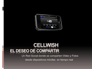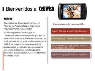 CellWish es una red social móvil que permite a los usuarios compartir videos y fotos en tiempo real desde sus dispositivos móviles. Los usuarios pueden crear contenido, compartirlo a través de canales temáticos en la plataforma web de CellWish e interactuar mediante comentarios y redes sociales. La aplicación aprovecha la tecnología móvil, la conectividad a internet y el almacenamiento en la nube para facilitar el acceso a contenidos generados por los usuarios.