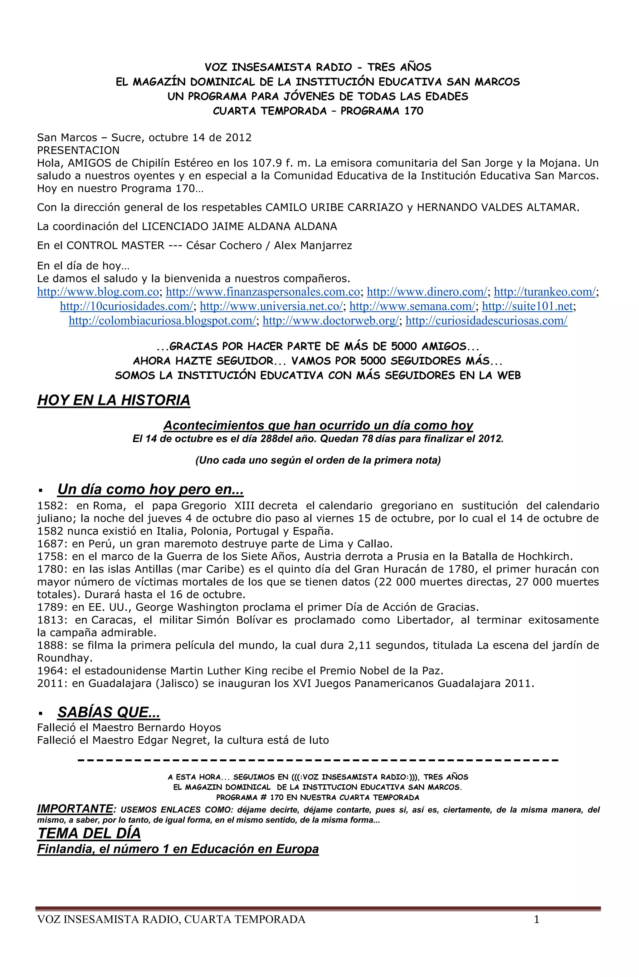 El documento resume el programa número 170 de la cuarta temporada de Voz Insesamista Radio, un programa de radio de la Institución Educativa San Marcos. El programa presenta las noticias del día, con secciones como Temas del Día sobre la educación en Finlandia, La Nota Científica sobre los Premios Nobel de Física y Medicina, La Nota Curiosa sobre costumbres al cruzar las piernas y los PIN más comunes, y La Nota Musical sobre el músico sucreño Juan Piña nominado a los Grammy Latinos. El programa es conducido por