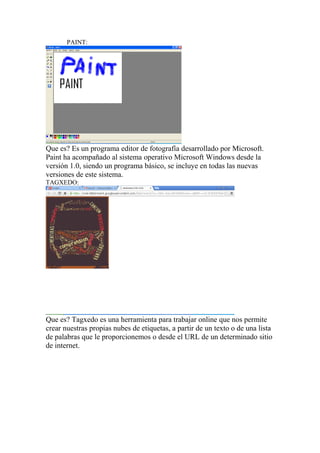 El documento resume brevemente varias herramientas digitales: Microsoft Word es un procesador de textos, PowerPoint es un programa de presentaciones, Paint es un editor de fotografías incluido en Windows, Tagxedo crea nubes de etiquetas a partir de texto, GoAnimate permite hacer videos animados, Glogster es una herramienta web 2.0, Blogger permite crear bitácoras en línea, Pixton permite crear cómics online, y SlideShare permite compartir presentaciones.