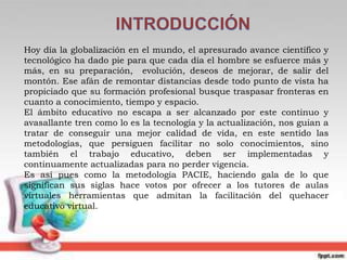 El documento describe la metodología PACIE para el uso de aulas virtuales. PACIE consta de 5 fases: Presencia, Alcance, Capacitación, Interacción y Elearning. El objetivo es facilitar el proceso de enseñanza-aprendizaje a través del uso de herramientas virtuales como aulas y campus virtuales. Las aulas virtuales permiten el acceso a la educación desde cualquier lugar y ofrecen ventajas como ahorro de costos y flexibilidad en el horario.
