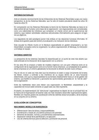 Este documento resume la evolución de la teoría de la organización desde sus inicios en el siglo XIX hasta la actualidad. Comienza describiendo las organizaciones cerradas y burocráticas del siglo XX, luego las organizaciones naturales que enfatizan las relaciones humanas, y finalmente las organizaciones abiertas que interactúan con su entorno. También resume los principales modelos y teorías de autores clave a lo largo de la historia de esta evolución conceptual.
