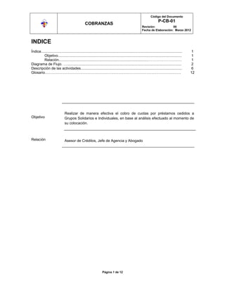 Este documento describe el proceso de cobranzas de créditos grupales. El proceso incluye realizar visitas de seguimiento y revisar pagos, notificar pagos vencidos a la junta directiva mediante formatos como la "Nota de Cobro Grupal", ofrecer opciones de arreglo de pago si hay mora, y notificar cobros extrajudiciales si el arreglo de pago es rechazado. El objetivo es realizar el cobro de cuotas de préstamos de manera efectiva.