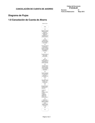 El documento describe el proceso de cancelación de cuentas de ahorro realizado por el auxiliar de caja. El proceso incluye recibir documentos del cliente, registrar la cancelación en el sistema, contar y grabar el efectivo retirado, actualizar la libreta de ahorro, imprimir un recibo, y entregar documentos al cliente.