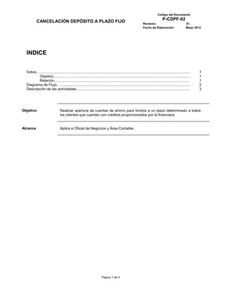 El documento describe el proceso de cancelación de depósitos a plazo fijo. El proceso comienza cuando un cliente solicita cancelar su depósito. Luego, el oficial de negocios ingresa la solicitud al sistema y genera una liquidación. El área contable emite un cheque y entrega los documentos al oficial, quien los entrega al cliente luego de obtener su firma. Finalmente, los documentos se archivan.