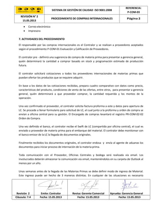 Este documento describe el procedimiento de compras internacionales de una empresa. Establece que el contralor es responsable de solicitar cotizaciones a proveedores internacionales precalificados, comparar ofertas y recomendar un proveedor a la gerencia general. Una vez aprobado el proveedor, el contralor tramita la factura proforma, la apertura de carta de crédito y envía los documentos al proveedor para el embarque. Finalmente, coordina el ingreso de la mercadería y su liberación aduanera.