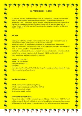 La provincia de El Oro se encuentra en el suroeste de Ecuador. Su capital es Machala. Es conocida por su producción bananera y camaronera para la exportación. Cuenta con 559,846 habitantes y limita al norte con Guayas y Azuay, al sur con Loja y Perú, y al oeste con el Océano Pacífico. Sus principales actividades económicas son la agricultura, ganadería y pesca.