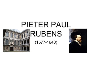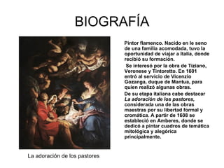 Pieter Paul Rubens fue un pintor flamenco renacentista que nació en una familia acomodada y pudo viajar a Italia para recibir formación artística. Se interesó por la obra de Tiziano, Veronese y Tintoretto. Más tarde trabajó para el duque de Mantua y destacó por su libertad formal y cromática en obras como La adoración de los pastores. Posteriormente se estableció en Amberes donde se dedicó principalmente a pintar temas mitológicos y alegóricos.
