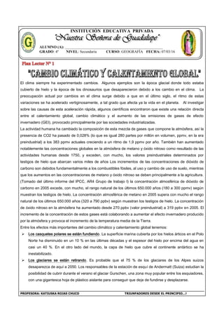 El documento describe los efectos del cambio climático y calentamiento global, causados principalmente por el aumento de los gases de efecto invernadero como el dióxido de carbono, metano y óxido nitroso debido a la actividad humana. Algunos de los efectos incluyen el derretimiento de los casquetes polares y glaciares, el aumento del nivel del mar, y fenómenos meteorológicos extremos. Además, podría haber escasez de agua y alimentos para millones de personas.