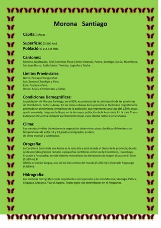 La provincia de Morona Santiago se encuentra en el sudeste de Ecuador. Tiene una población de 143,348 habitantes y su capital es Macas. Limita con las provincias de Pastaza, Tungurahua, Zamora Chinchipe, Azuay, Chimborazo y Cañar. Sus principales recursos económicos son la agricultura, ganadería, minería y madera. No ha desarrollado industrias aparte de la manufacturera y del té. Sus principales productos de comercio incluyen ganado, maíz, fréjol