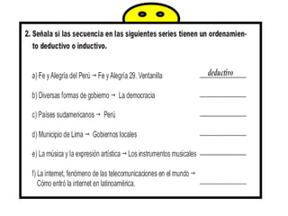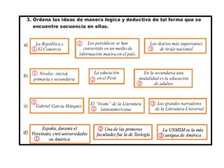 Este documento ofrece varias formas de organizar la información en un texto, incluyendo el orden lógico, lineal, deductivo, descriptivo, clasificatorio y del método científico. Explica cada orden con ejemplos detallados. También incluye un ejercicio de verdadero o falso sobre el orden correcto de presentar la información.