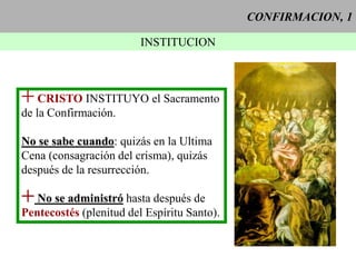La confirmación fue instituida por Cristo para dar la plenitud del Espíritu Santo, aunque no se administró hasta después de Pentecostés. El rito esencial implica la unción con crisma en la frente y la imposición de manos por el obispo, aunque no es necesaria para la validez. La confirmación aumenta la gracia santificante y los dones del Espíritu Santo, otorga gracia para profesar públicamente la fe y marca la pertenencia total a Cristo. Aunque no es necesaria con necesidad de medio, es