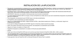 Este documento describe las características y funcionalidades clave de Microsoft PowerPoint. Explica que PowerPoint permite usar plantillas, texto e imágenes con diferentes formatos y estilos, y herramientas de animación. También cubre cómo instalar PowerPoint Viewer para ver presentaciones, empaquetar presentaciones para CD, y diseñar presentaciones animadas, interactivas y automáticas.