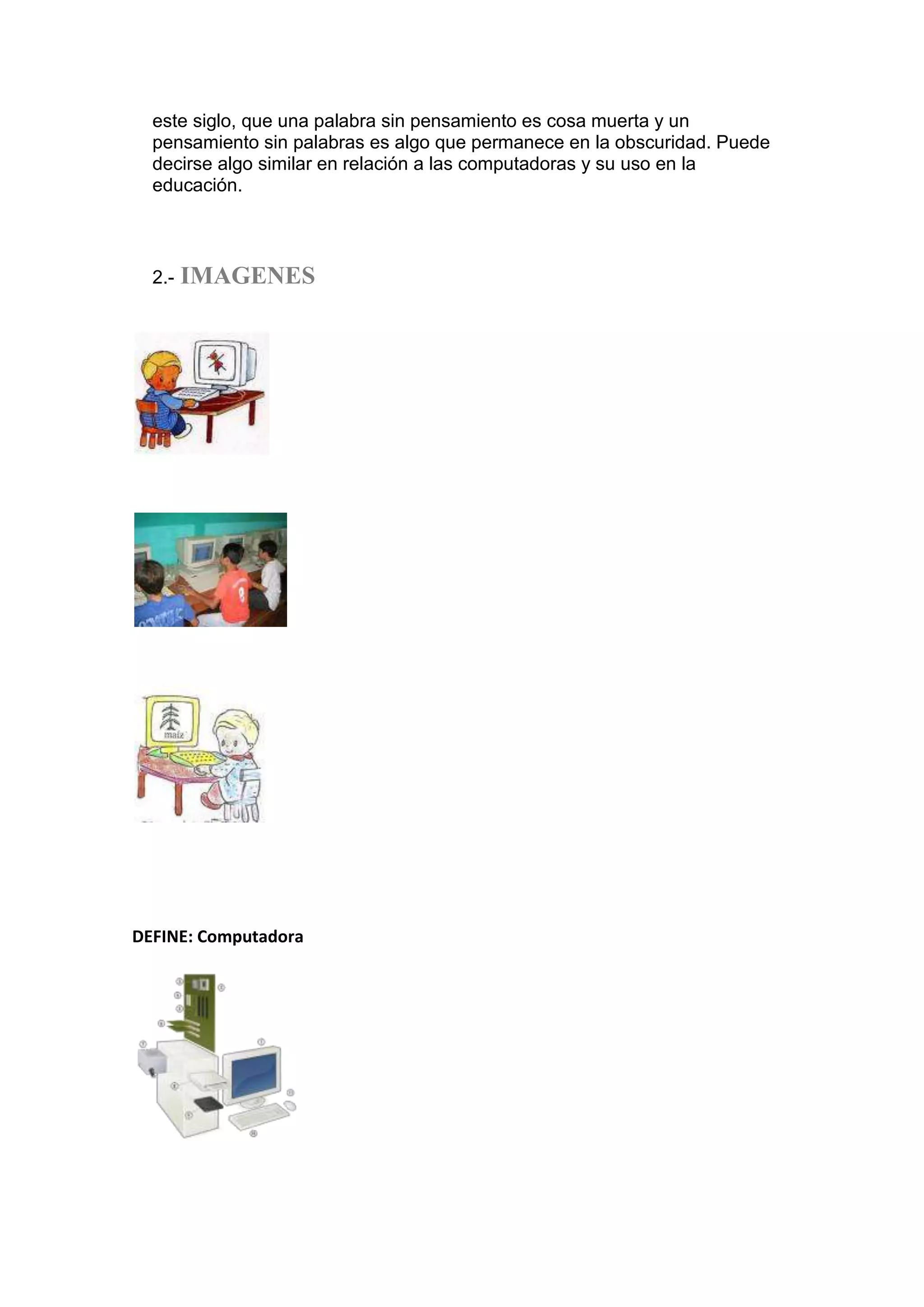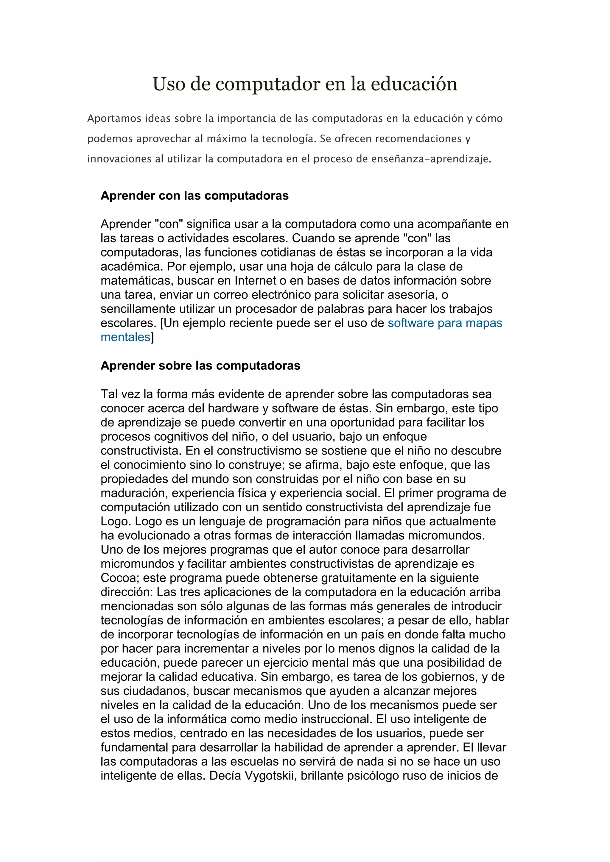 El documento describe tres formas en las que se puede usar la computadora en la educación: 1) aprender con las computadoras al incorporarlas en tareas escolares, 2) aprender sobre las computadoras y su hardware y software, y 3) el uso inteligente de las computadoras como medio instructivo centrado en las necesidades de los estudiantes. También explica brevemente el origen de las universidades en las escuelas persas y árabes.