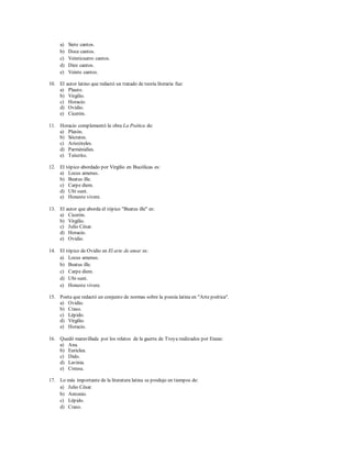 El documento presenta preguntas sobre autores y obras de la literatura latina clásica. Aborda temas como la trilogía capitolina de Augusto, personajes y tramas de La Eneida de Virgilio como Eneas, Dido y Turno. También menciona a otros autores como Horacio, Ovidio y sus obras. Las preguntas evalúan conocimientos sobre géneros, temas, contexto histórico y detalles de las principales obras de este periodo literario en Roma.